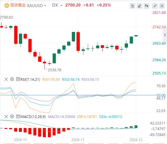 周三亚盘,黄金交投于2700.20附近。黄金价格上涨的驱动因素之一是市场对美联储(Fed)将在12月会议上降息的预期。投资者似乎相信美联储将在12月17日至18日的会议上降息。CMEFedWatch工具数据暗示,期货市场定价美联储主席及其公司将联邦基金利率下调25个基点(bps)的可能性为86%。
