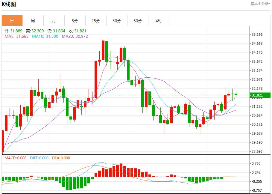 现货白银:截止北京时间21:26,现货白银下跌,现报31.826,跌幅0.18%。纽市盘前,白银价格恢复积极交易,以加强对未来几个交易日继续看涨趋势的预期,实现我们等待的目标32.86美元的道路是开放的,注意到突破它将延长牛市,达到33.50美元,作为下一个积极的站。