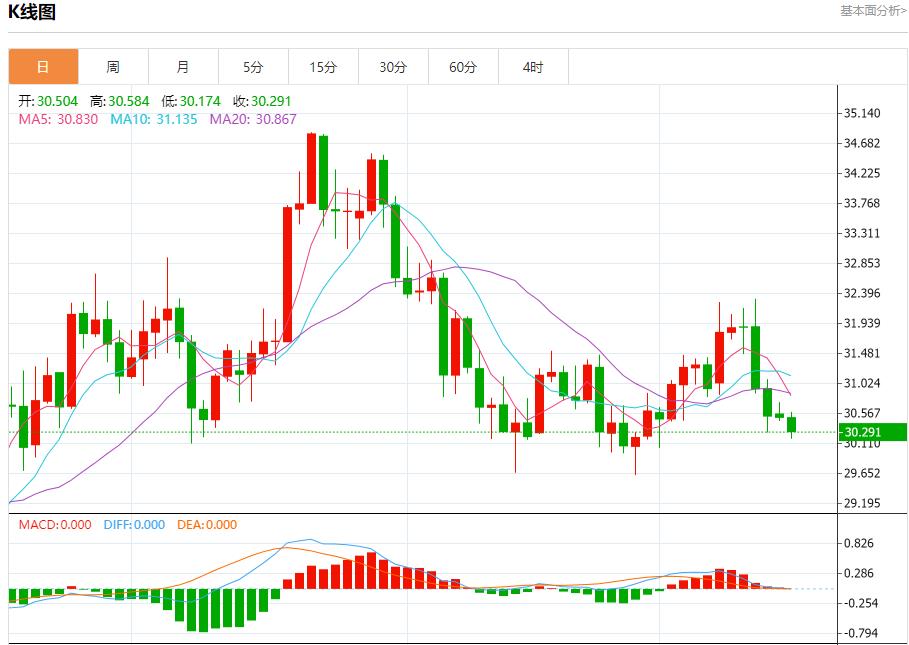 现货白银:截止北京时间21:20,现货白银下跌,现报30.302,跌幅0.67%。纽市盘前,白银价格显示出平静的负面交易,逐渐远离30.63美元的水平,加强了今天剩余时间继续看跌趋势的预期,我们认为实现我们下一个目标29.63美元的道路是开放的,提醒您预期的下跌的持续取决于30.63美元以下的价格稳定。