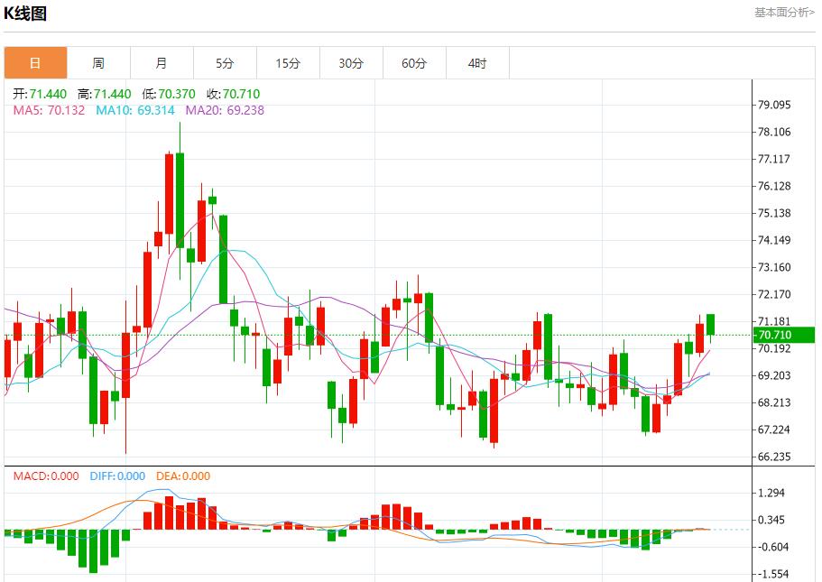 原油市场:截止北京时间21:16,美油下跌,现报70.700,跌幅0.83%。纽市盘前,原油价格显示出一些轻微的看跌倾向,以接近测试关键支撑70.58美元,注意到价格需要在该水平上方盘整,以保持今天的看涨趋势,其下一个目标位于72.15美元。