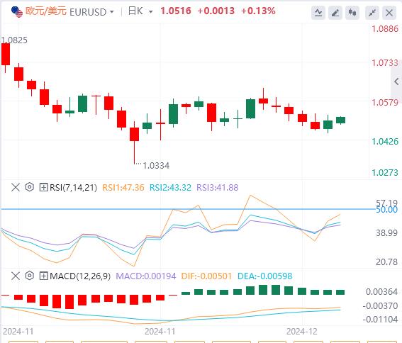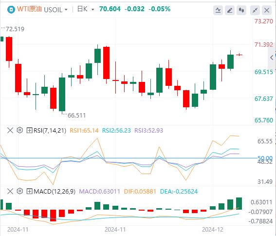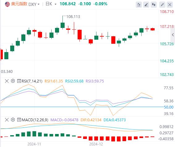 12月16日,北京时间周一亚市早盘,美元指数徘徊在106.84附近。上周五,美元指数在107关口附近徘徊,最终收跌0.071%,报106.94,仍持稳在两周多以来的高位,并创一个月来最佳单周表现。美债收益率延续涨势,两年期美债收益率收报4.247%,10年期美债收益率收报4.396%。值得注意的是,3个月/10年期美债收益率曲线自2022年11月初以来首次结束倒挂状态。由于美元保持坚挺,现货黄金进一步远离五周高点,失守2650美元大关,最终收跌1.22%,报2648.39美元/盎司,但在美联储本周降息预期的支撑下全周仍录得上涨。现货白银最终收跌1.36%,报30.57美元/盎司。由于市场担心针对俄罗斯和伊朗的额外制裁可能会收紧供应,而欧洲和美国的降息有利于提振燃料需求,两油止步两周连跌。WTI原油一度逼近71关口,最终收涨1.45%,报70.67美元/桶;布伦特原油收涨1.24%,报74.08美元/桶。