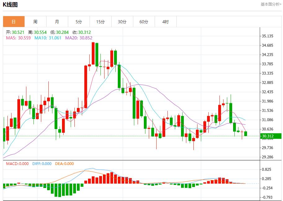 现货白银:截止北京时间21:20,现货白银下跌,现报30.290,跌幅0.75。纽市盘前,白银价格返回测试关键阻力30.63美元,并在该阻力下方保持稳定,注意到随机指标失去了积极的动力,显示出超买信号,等待推动价格恢复未来一段时间的预期熊市趋势,目标29.63美元是下一个主站。