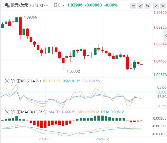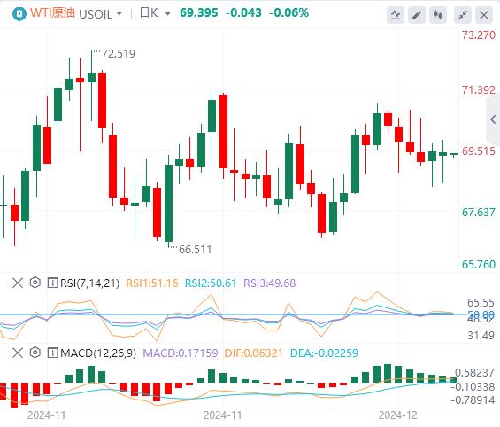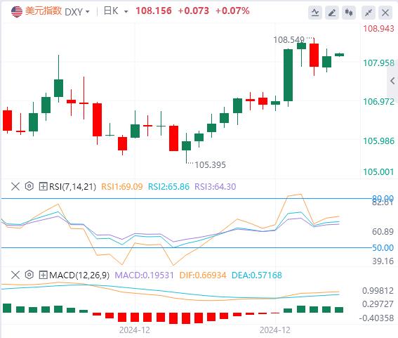 12月24日,北京时间周二亚市早盘,美元指数徘徊在108.15附近。周一,随着美国政府避免了关门危机以及交易员继续权衡明年降息幅度较小的前景,美元指数继续徘徊在两年高位,最终收涨0.24%,报108.08。美债收益率全线反弹,两年期美债收益率收报4.342%,10年期美债收益率收报4.593%。受美元和美债收益率回升的拖累,现货黄金小幅走低,最低触及2608.08美元/盎司,最终收跌0.27%,报2613.7美元/盎司。现货白银则横盘震荡,最终收涨0.46%,报29.65美元/盎司。由于市场对担心明年供应过剩的担忧仍存以及美元走强,油价在圣诞节假期前的清淡交易中基本持平。WTI原油最终收跌0.01%,报69.47美元/桶;布伦特原油收涨0.04%,报72.68美元/桶。