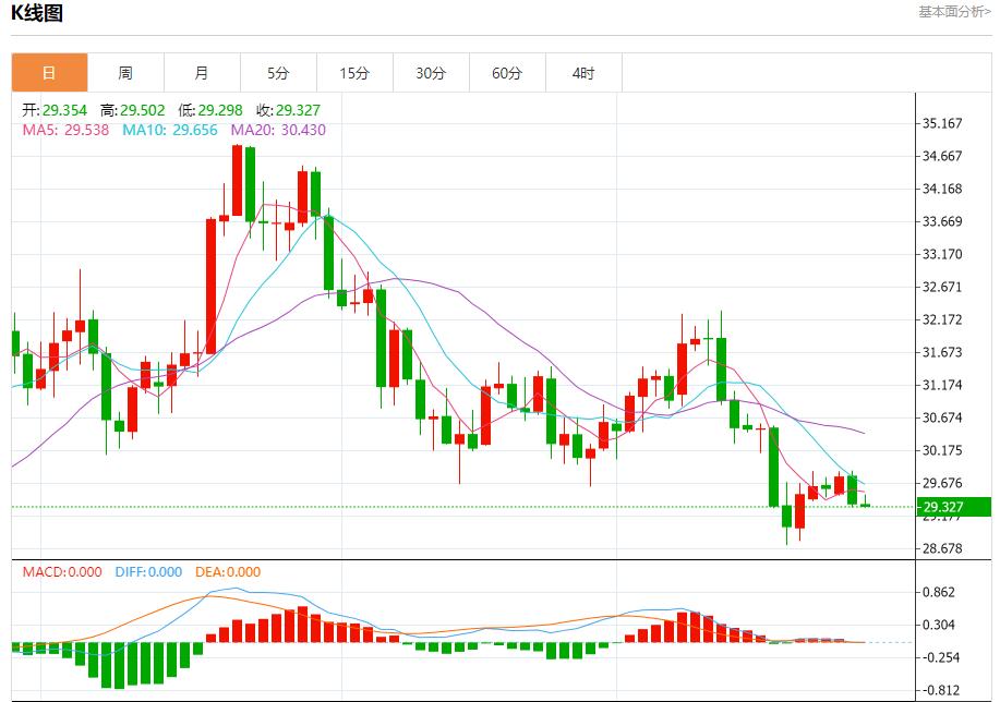 现货白银:截止北京时间21:25,现货白银下跌,现报29.321,跌幅0.15%。纽市盘前,在前几个交易日测试EMA50后,白银价格熊市反弹,再次跌破29.63美元,以保持熊市趋势在即将到来的时期有效,等待测试28.40美元作为第一站。