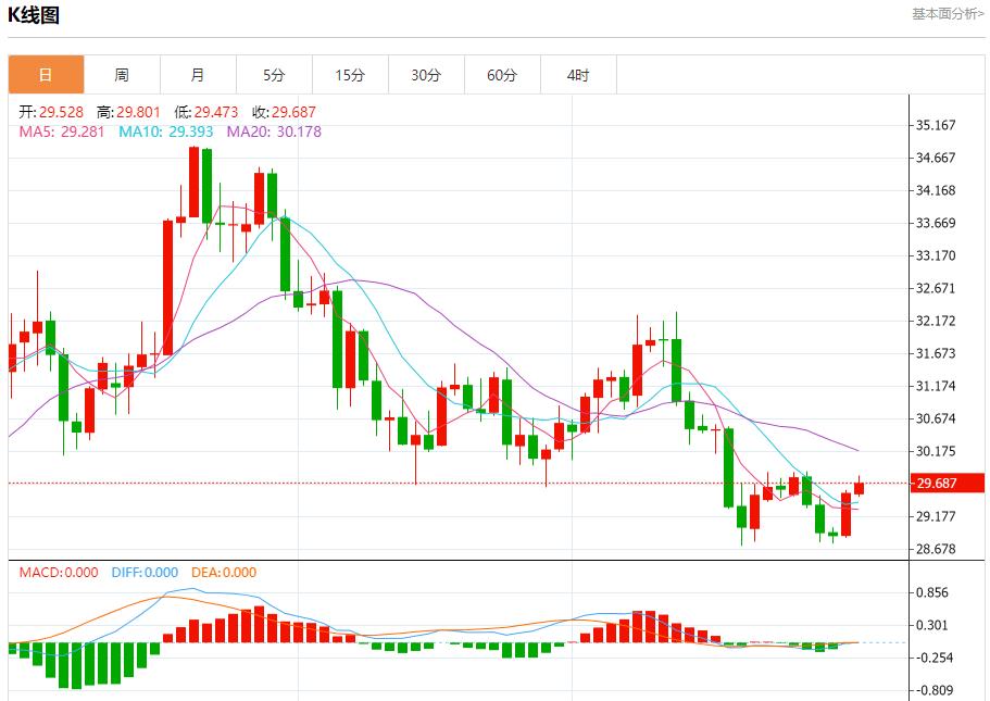 现货白银:截止北京时间21:25,现货白银上涨,现报29.707,涨幅0.59%。纽市盘前,白银价格显示出更多的看涨倾向,以测试29.63美元的水平,同时通过随机指标见证明显的超买信号,等待推动价格熊市反弹,并恢复日内和短期的预期熊市趋势,其下一个目标位于28.40美元。