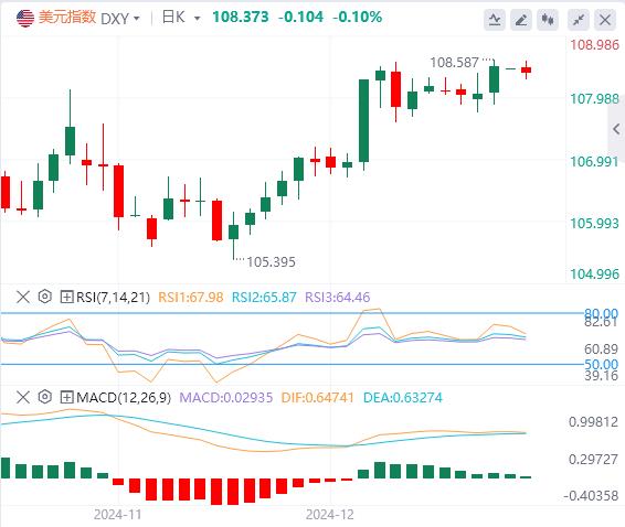周二(2024年12月31日),因为美联储将利率维持在高于其他央行的水平,美元指数创下两年新高,最高触及108.59,截至目前,美元报价108.37。