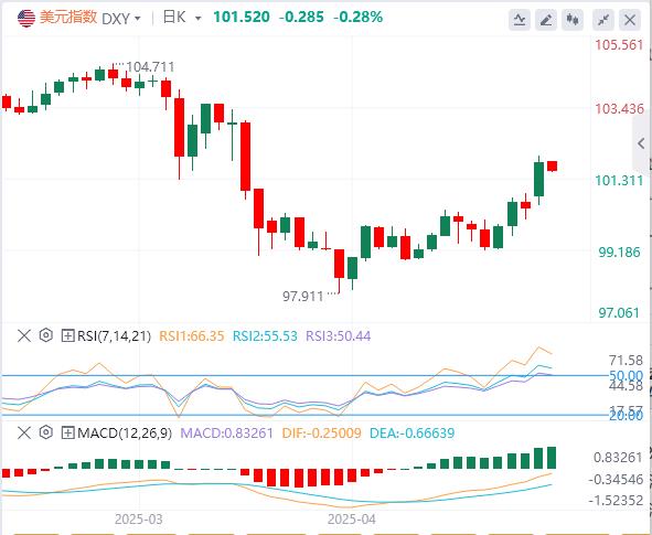 Na segunda -feira, o índice do dólar americano se aproximou de 102 e, a partir de agora, o preço em dólares dos EUA é 101,52.
