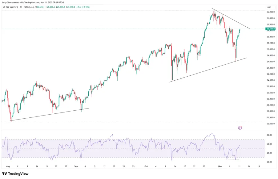 Espera-se que a liquidez do mercado retorne se o governo dos EUA reabrir suas portas. Ao mesmo tempo, Trump chegou a dizer que consideraria a emissão de um “dividendo tarifário” de 2.000 dólares para a maioria dos americanos. Espera-se que o otimismo continue a estimular a subida do índice Nasdaq 100 no início desta semana.