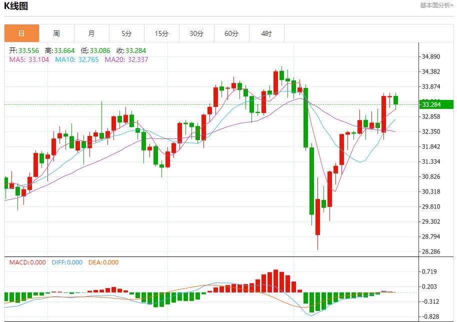 現貨白銀:截止北京時間20:20,現貨白銀下跌,現報33.290,跌幅0.78%。紐市盤前,白銀價格經歷了平靜的早盤交易,隨著(RSI)上負面信號的出現,導致其下跌,試圖獲得可能有助於其恢復和再次上漲的積極動機,在短期基礎上沿著看漲的修正趨勢線交易。