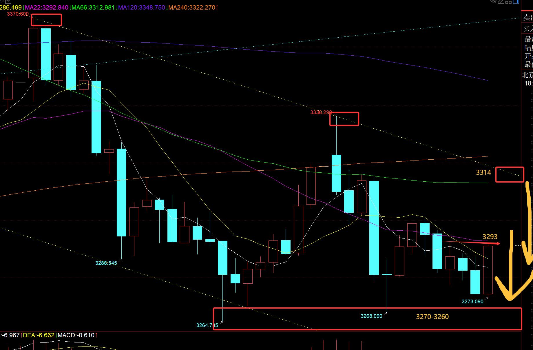 第四,黃金小時線級別:亞盤從3336跳水跌至3268,歐盤從3300震盪一路慢跌至3273,整體亞歐盤的走勢偏下行偏弱,那麼今晚仍傾向於壓制看跌;只是低點也在小碎步慢上移,從3260到3264到3268再到3273;這樣可能就存在震盪反复掃盤,慢跌好端端的,突然急拉;拉升好端端的,突然急跌;先關注中軌3293下,也是歐盤的一處開跌口,若向上突破,則關注3314,大陰開跌口,也是黃色通道的上軌承壓點,觸及逢高看跌回落,等什麼時候有效失守3270-3260,則會試探下一個支撐3245、3228等;