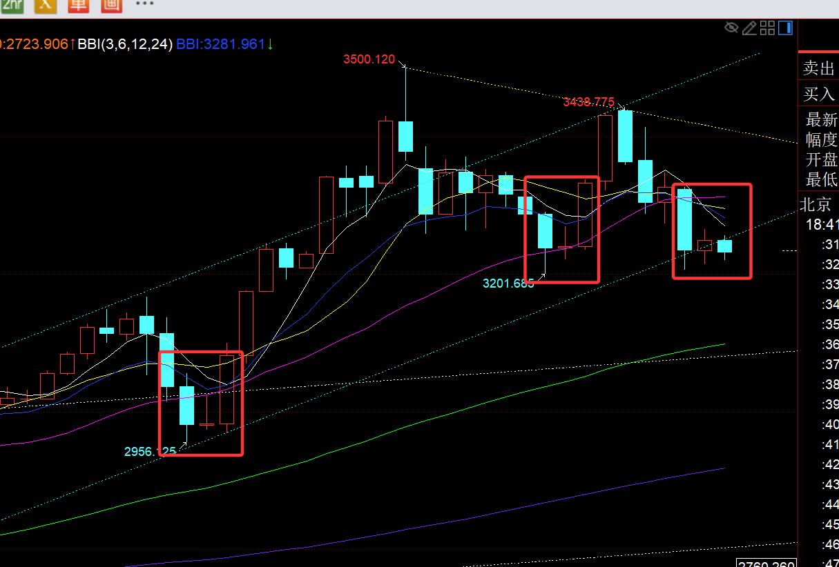 第一,黃金日線級別:昨日收報小陽K,接近十字K,結合前日收報大陰,這種形態近期出現多次,清明和五一都是類似循環形態,第三日緊跟著不是走弱,而是大陽100美金上攻企穩,這次是否也是出現呢?從當前走勢來看,的確很難,被壓制的很死;不過,還有幾個方面有利於金價隨時上攻:一個則是3200關口仍堅守著;另一個是美元這兩日大幅度下跌,已經把前日大陽漲幅給吞沒回去;所以,短期來講,3200關口能否堅守是比較關鍵的,以及能否收報一根不錯的陽K也是短期企穩的關鍵;這次調整時間是有些長,從周線級別來看,未來幾週都可能處於某一個大區間寬幅整理,但從日線級別來看,只要能穩住3200,應該可以出現W形態走法,去測試3500-3438這條趨勢阻力線,對應大概3400之下;反之,若穩不住3200關口,則會可能走M形態,向下就還有一波修正去向66日均線3100之上去靠攏尋求下一個關鍵位置的企穩;