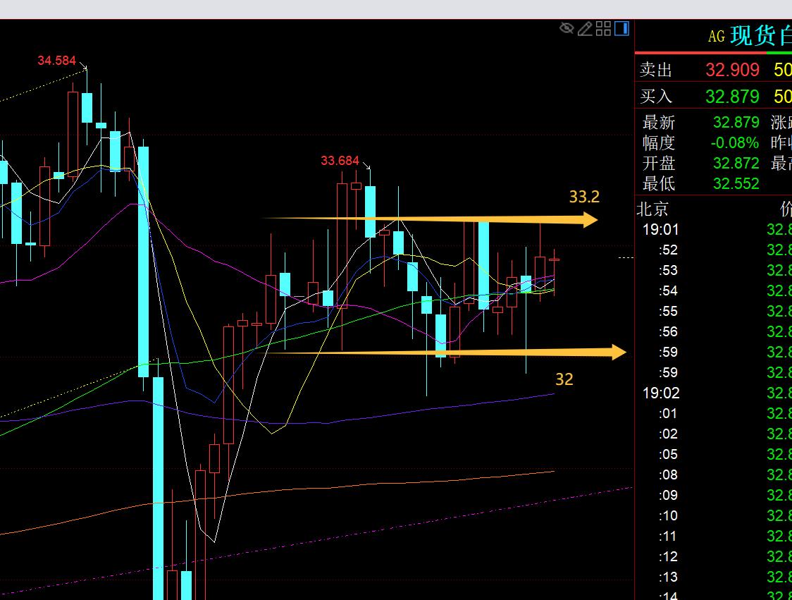 白銀方面:日線級別近期也是震盪,不過它相對抗跌,32多次試探都是長下影K或大陽反補,因此繼續震盪看漲為主來對待,阻力33.2、33.65,依托32.5之上或32之上去擇機企穩看漲;