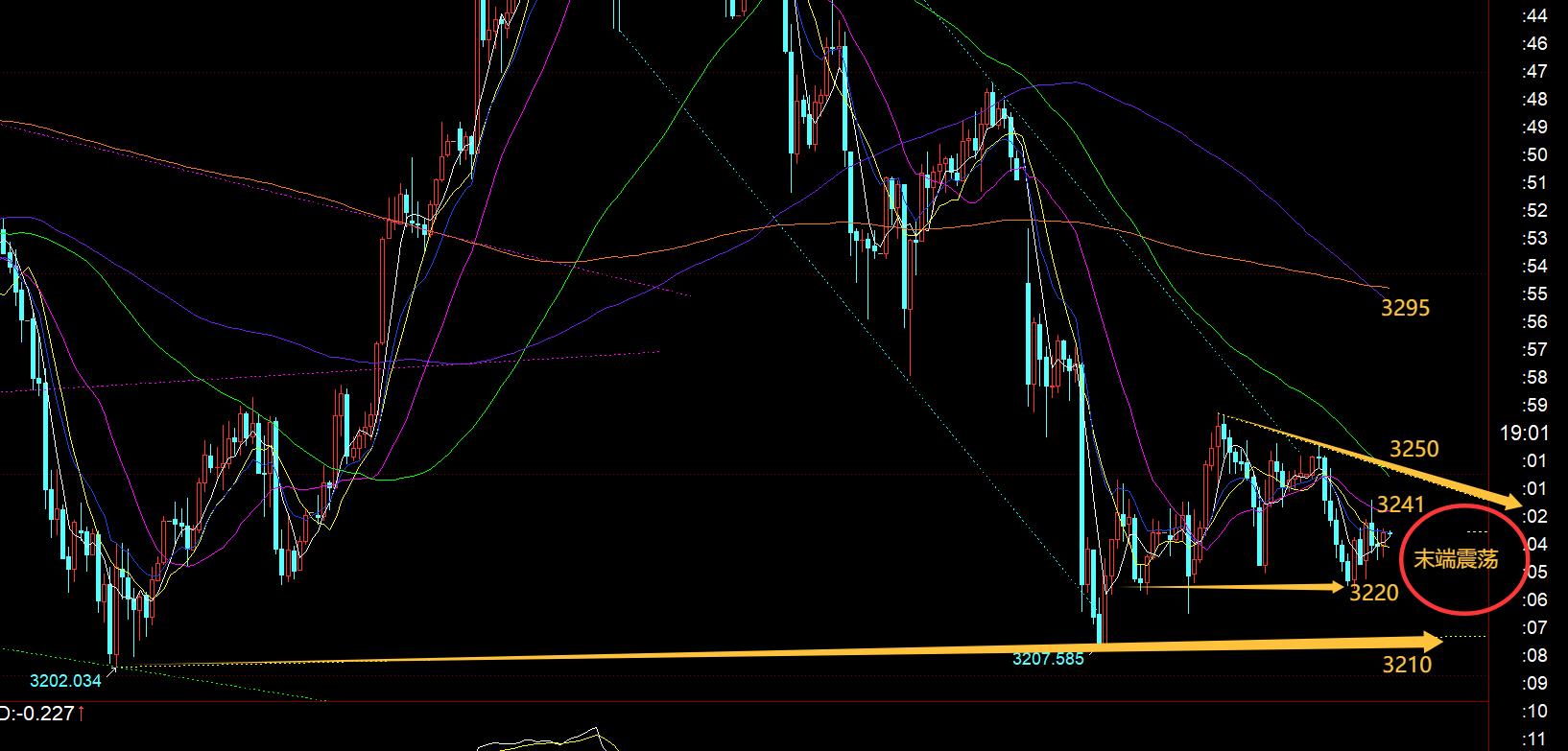 第三,黃金小時線級別:原本前兩日底部低點逐步上移,3207-3215-3225和3248-3265可以形成一個緩慢上行通道發展,原本認為再試探上軌,可以觸及3270-3280區域,就是短線不錯的壓制看跌位置,但並未給到機會;今日亞盤直接連跌刺破了3225低點進行反彈至618分割阻力3243,也是中軌;有所打破了此通道,陷入上圖新的收斂區間之內;今晚66日均線,也是上軌3250-51阻力非常關鍵,若仍壓制,則繼續走末端來回整理;若突破站上,短期反彈力度就會加強,不排除直接測試年均線3295;而下方3220-3210-3200都有短期關鍵支撐,3220是橫盤位置,3210是3202-3207趨勢支撐線衍生點,而3200是市場的心理關口;所以,今晚還要繼續震盪來演繹,等待關鍵阻力或關鍵支撐突破情況;