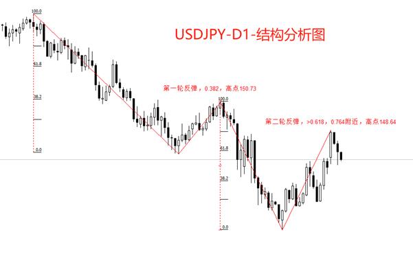 走勢結構角度看,日線級別,今年以來,日元經歷了兩輪趨勢性下跌。第一輪下跌後的反彈高點在0.382黃金分割附近,幅度較小;第二輪反彈高點超過0.618,約在0.764附近,高點148.64。由於反彈幅度較大,導致反彈高點進入第一輪下跌波段內部,意味著空頭趨勢有反轉可能,需保持警惕。接下來的一輪下跌至關重要。如果跌勢較為流暢,且跌破中期支撐位139.87點,則空頭趨勢延續。如果跌勢在反彈波段內部遭遇強力支撐,則後市發展傾向於空轉多或者橫盤震盪。