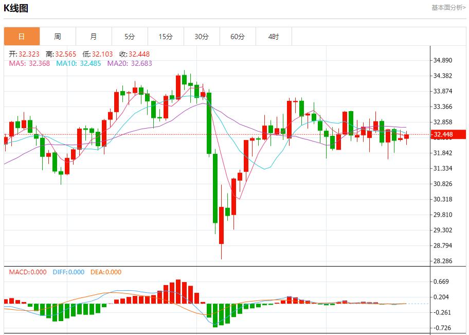 現貨白銀:截止北京時間20:20,現貨白銀上漲,現報32.452,漲幅0.37%。紐市盤前,(白銀)價格在最近的日內交易中出現波動,在(RSI)上出現積極信號,對價格形成一些支撐,但價格在EMA50下方保持穩定,短期內處於小幅熊市。