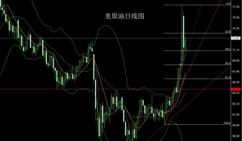 美原油市場昨日高開在76.07的位置後行情拉升給出76.65的位置後行情強勢回落,日線最低給到了69.33的位置後行情尾盤拉升,日線最終收線在了71.44的位置後行情以一根下影線極長的大陰線收線,而這樣的形態收尾後,日線盤整信號,點位上,今日給出74.5空止損75.1,下方目標看73.7和73和72.2-71.5.