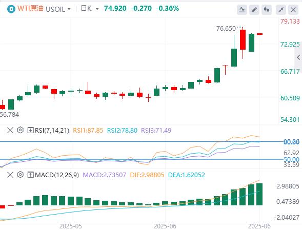 週三亞盤,原油交投74.92附近。隨著中東緊張局勢升級以及美國(US)捲入衝突的可能性增加,WTI價格延續了漲勢。美國總統唐納德·特朗普在他的社交媒體平台上發帖,呼籲伊朗“無條件投降”。在以色列和伊朗之間的緊張局勢升級的情況下,人們擔心美國將捲入衝突,這推高了WTI價格。此外,一名高級指揮官週六表示,主要石油生產國伊朗正在考慮關閉霍爾木茲海峽。反過來,這可能會在短期內推高原油價格。