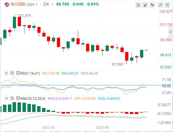6月18日,北京時間週三亞市早盤,美元指數徘徊在98.78附近。週二,美國5月零售銷售弱於預期,但消費者支出仍然受到穩健薪資增長的支撐。美元指數在數據公佈後趨弱,但隨著市場消化數據反映的喜憂參半的情況,美元迅速扭轉跌勢,最終收漲0.69%,報98.84。基準的10年期美債收益率收報4.3940%,2年期美債收益率收報3.9600%。儘管伊朗和以色列的緊張局勢提振了避險需求,但美元走強限制了漲幅,現貨黃金最終收漲0.14%,收報3389.49美元/盎司;現貨白銀價格飆升至13年新高,最終收漲2.32%,報37.13美元/盎司。由於特朗普敦促所有人撤離德黑蘭,地緣政治緊張局勢令市場神經緊繃。 WTI原油最終收漲5.38%,報73.75美元/桶;布倫特原油收漲6.31%,報77.01美元/桶。