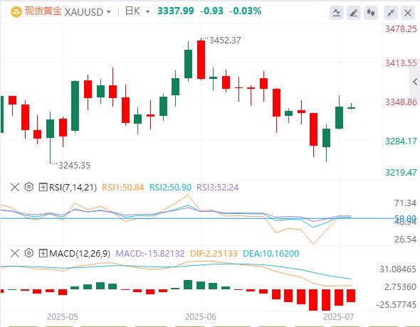 週三亞盤,黃金交投337.39附近。特朗普減稅議案點燃避險熱潮,美聯儲降息預期再升溫,黃金市場在2025年7月初迎來了新一輪的上漲熱潮,現貨黃金價格週二飆升逾1%,觸及6月24日以來的最高水平3357.82美元/盎司,收盤報3338.77美元/盎司,為連續兩個交易日上漲。
