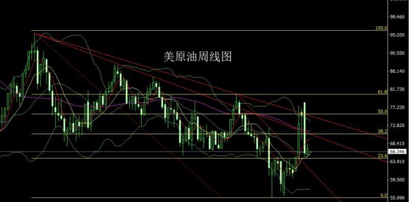 美原油市場上週區間盤整,周初開盤在66.25的位置後行情先回落,週線最低給到了65.23的位置後行情強勢拉升,週線最高觸及到了68.31的位置後尾盤震盪回落,週線最終收線在了67.14的位置後,週線以一根上影線稍長於下影線的小陽線收線,而這樣的形態收尾後今日低開後,67.1空止損67.5下方目標看66.5和66和65.5.
