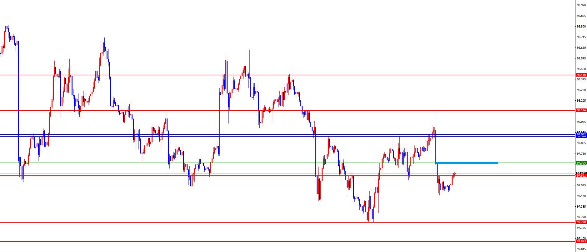 從多周期分析,週線級別來看近期價格在周線關鍵上下盤整,目前週線阻力於97.90區域,價格在此位置之下偏空對待,價格只有後續週線收盤在此位置上方才會轉多。從日線級別看,隨著時間的推移目前日線阻力於97.90區域,目前需要關注價格能否站穩日線及週線共振阻力是關鍵。從四小時上看,昨日價格日內繼續在四小時支撐上方運行,但是在美盤借助數據快速承壓並下破,目前四小時上美指有震蕩的表現,整體關注區間,只有破位後才會延續,中間97.70位置作為中間分水嶺對待。