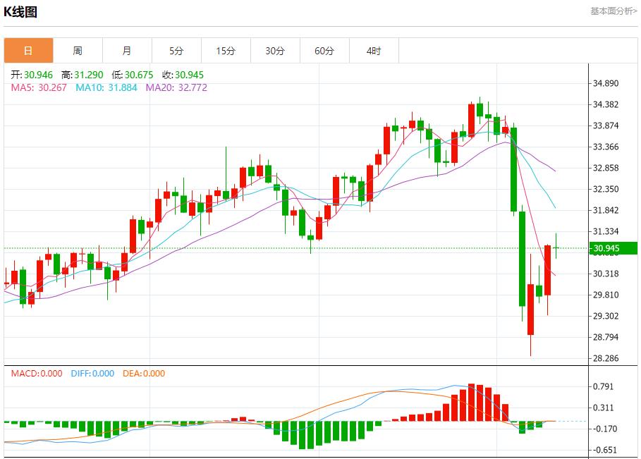 現貨白銀:截止北京時間20:18,現貨白銀下跌,現報30.945,跌幅0.16%。紐市盤前,銀價在最近的盤中水平下跌,沿著上升趨勢線的牛市修正波占主導地位。價格試圖緩解相對強度指數(RSI)中顯示的明顯超買狀況,旨在收集積極的動力,幫助其恢復和恢復當前的看漲修正。