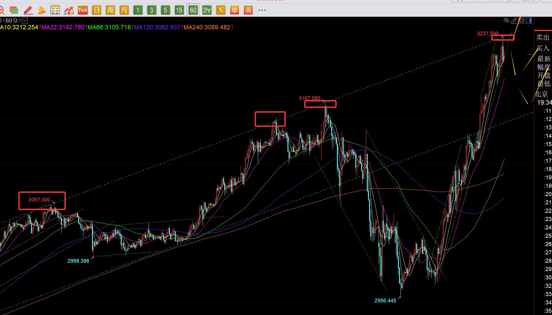 第三,黃金小時線級別:隔夜強勢收盤於高位,今日早間又是直接續漲,也比較正常,就看個人的膽量勇氣;午後小幅回落一波,歐盤繼續連陽破高,那麼此時美盤前的收陰當做誘空,今晚一般會有二次拉升,關鍵阻力就是上圖前期藍色通道上軌3238-37一線,而關鍵支撐是綠色通道下軌3212一線,也是10均線位置;今晚關注這兩處的有效得失,按照正常劇本走,應該是先二次拉升,再試探通道上軌,若仍過不去,則進行向下回調;若強攻大陽站上了,那麼又是非常恐怖的拉高;反之,若二次拉升力度不夠,反而向下有效破位下軌,則會轉為高位震盪偏回調修正,下方指向3190一線、3175一線,強支撐3145一線再尋求企穩拉升;每次到了美盤比較妖一些,因此謹慎對待,輕倉試探;
