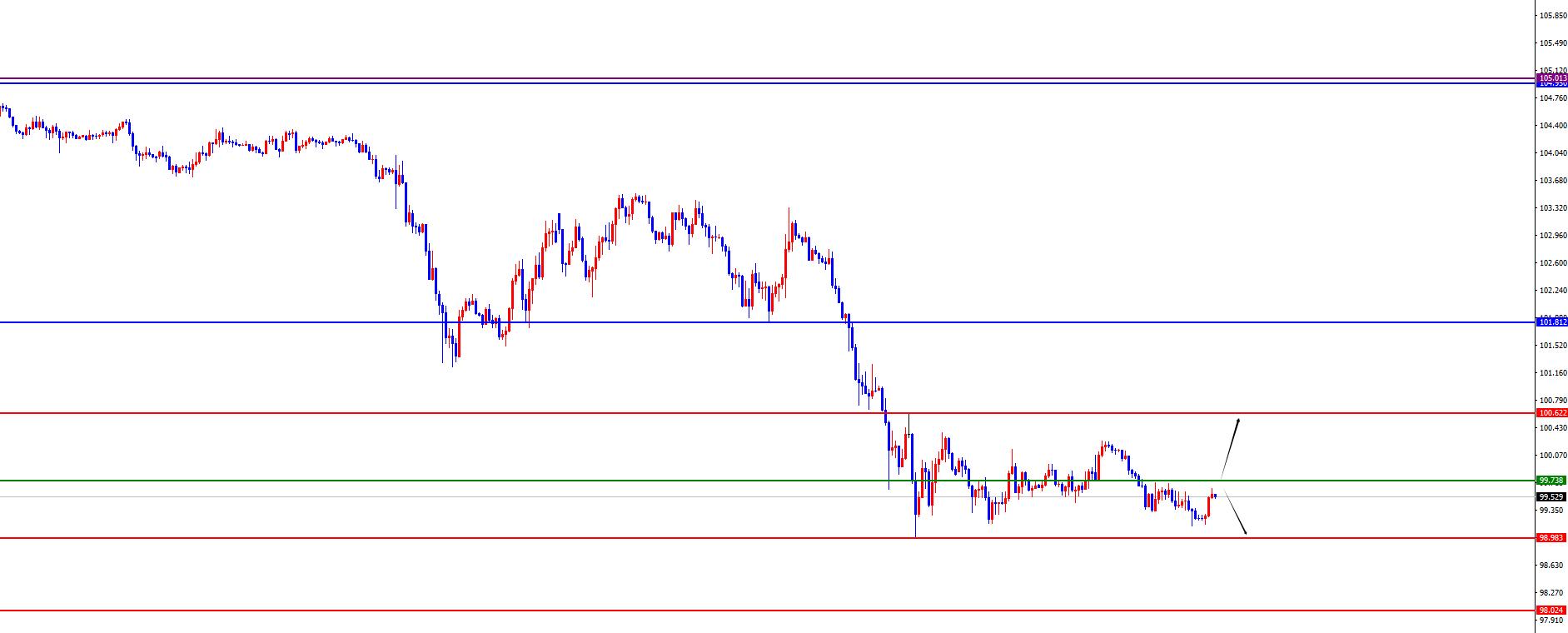 在美元指數的表現上,週三美元指數呈現出下跌態勢。當日美元指數價格最高攀升至100.152的位置,最低則下探至99.145,最終以99.246的價格收盤。回顧週三市場表現,在早盤期間價格先承壓下跌,之後價格延續弱勢並大陰收尾。從周線級別來看價格壓制在105區域阻力,那麼從中期視角出發,美元指數的走勢將更偏向於空頭。在日線級別上價格壓制在101.80區域的阻力位,那麼從波段看空頭的思路進行操作。短期四小時上看99.70區域是美指短期分水嶺,價格處於多周期阻力下方,但是短期四小時和一小時上價格有反彈的表現,所以暫時先謹慎追多,重點關註四小時阻力得失情況,一旦上破則需要關注進一步延續。
