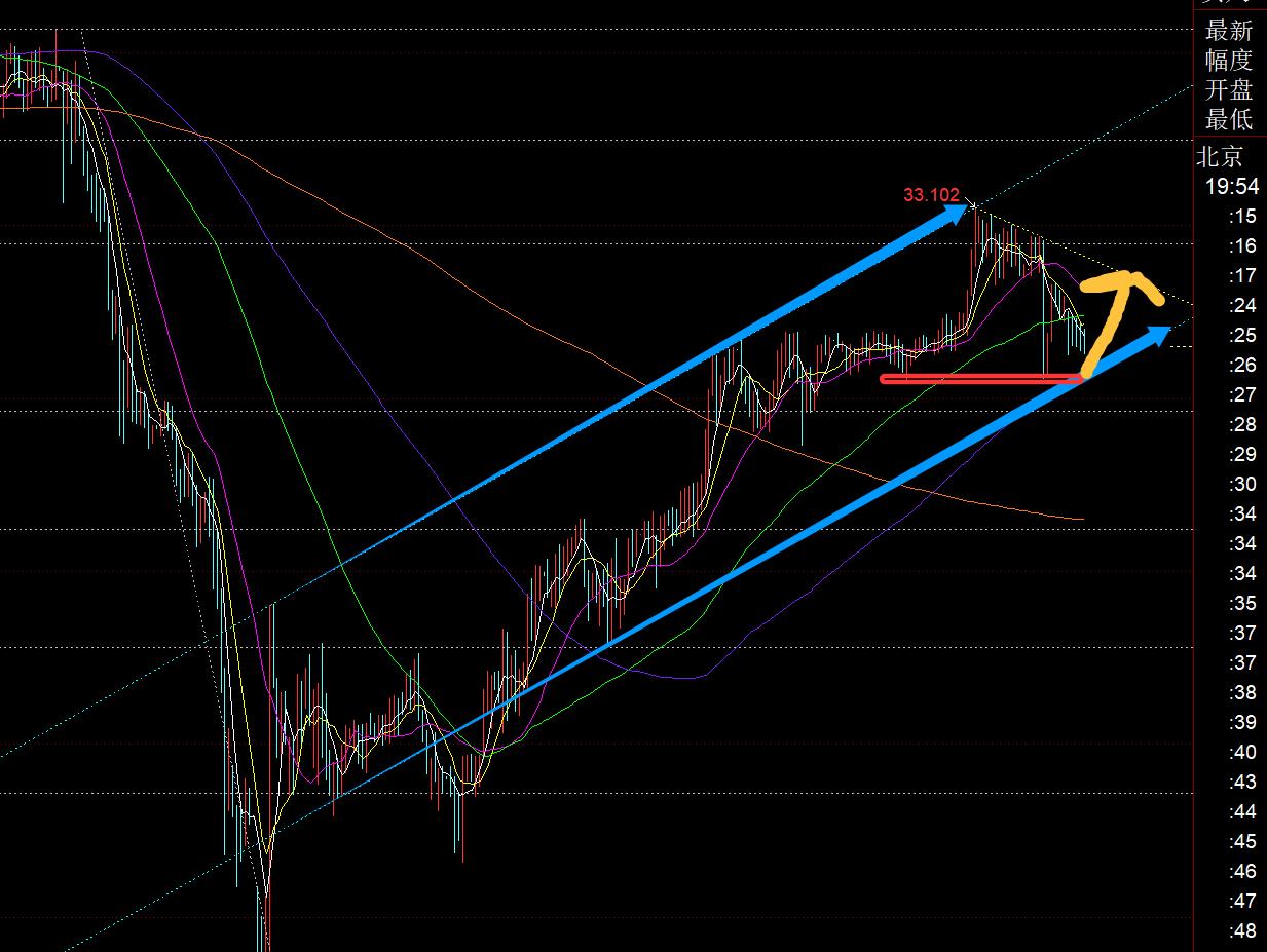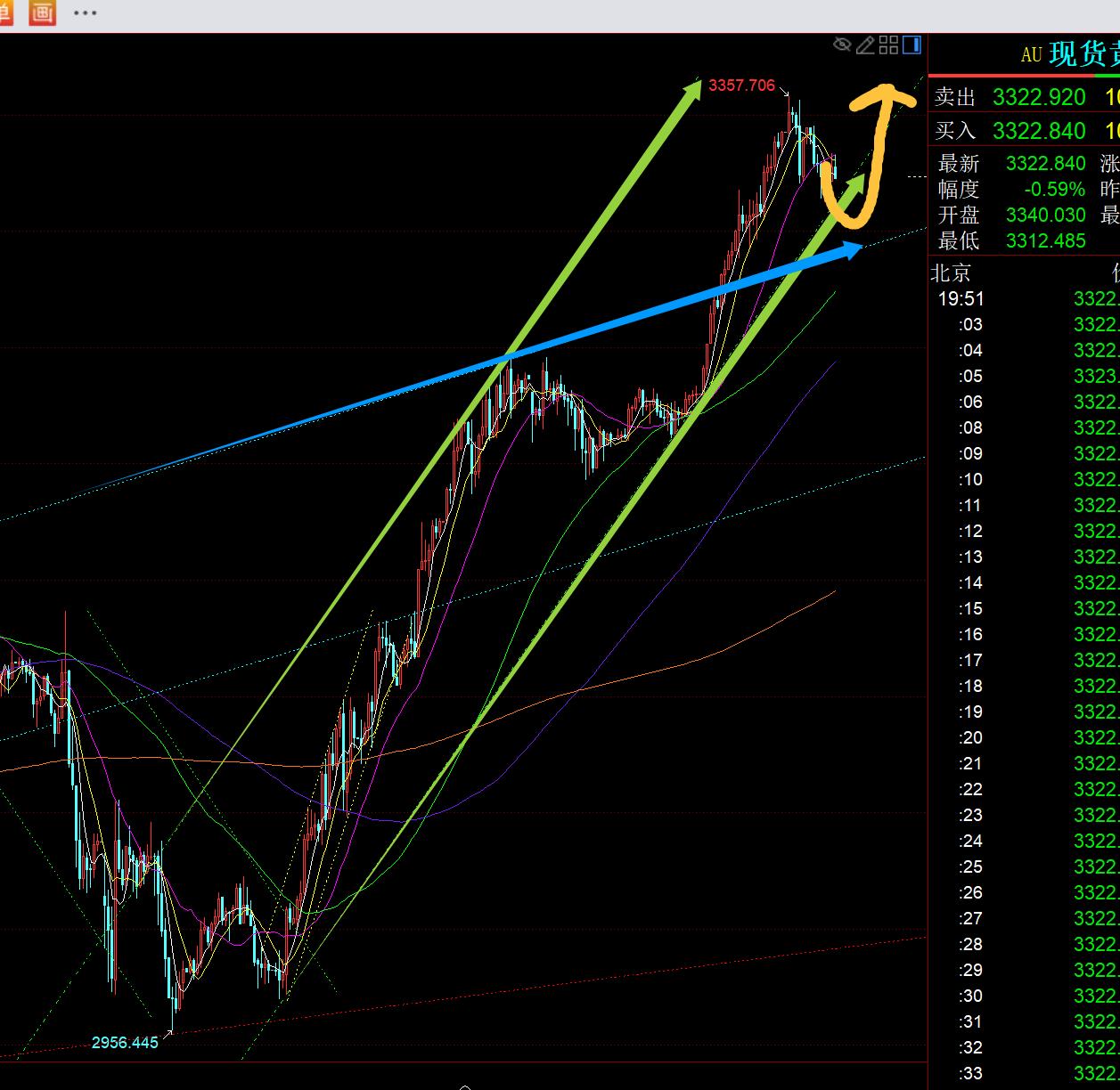 第三,黃金小時線級別:今日難得起來早點,就想抓一下每次亞盤開盤的一波續漲;結果今日並未實現,反而短期展開一定的下跌回調;當觸及中軌3220後,收報飽滿大陽,已具備企穩,等待歐盤發力上攻,但它開始走了震盪不延續,和前日一個走法;因此接下來就是耐心等整理結束,短期承壓點中軌,也是10均線3332-33一線,這裡可能會多次試探,但未突破站上之前,不去追漲,下方留意上圖的通道下軌支撐,目前上移3314,還有就是前期通道的上軌回踩確認點,集中3300-3290範圍,因為上行通道不確定會不會搞假刺穿;