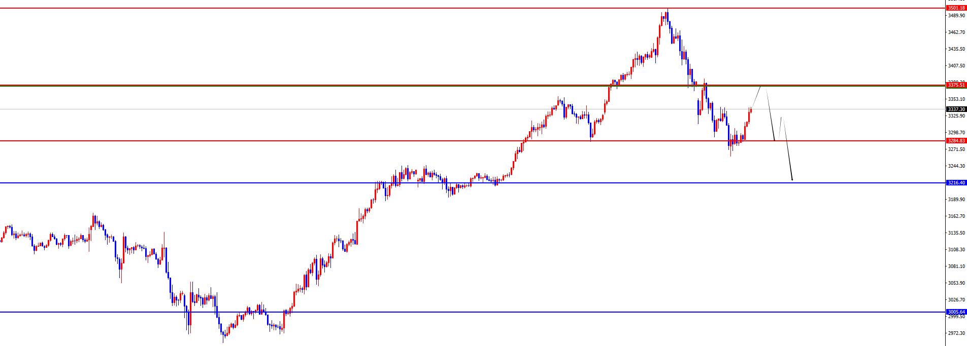 從多周期分析,首先觀察月線節奏,價格前期是三個月上漲後出現單月修正,近期屬於四個月上漲出現單月修正,所以按照節奏上看4月整體看多,但是對於五月份就要重點注意市場風險。從周線級別來分析,黃金價格受撐於3006區域的支撐位。那麼從中線角度來看,我們可以持續保持看多的觀點。從日線級別觀察,目前價格受撐於3220區域支撐,從波段的角度持續看多,但是目前需要注意市場二次回踩日線支撐。對於短期四小時上價格在周一跌破後,昨日持續壓制在四小時阻力下方,目前隨著時間的推移暫時需要關注3374-3375區間阻力,後續不破則持續看承壓,下方關注3280-3220區域。